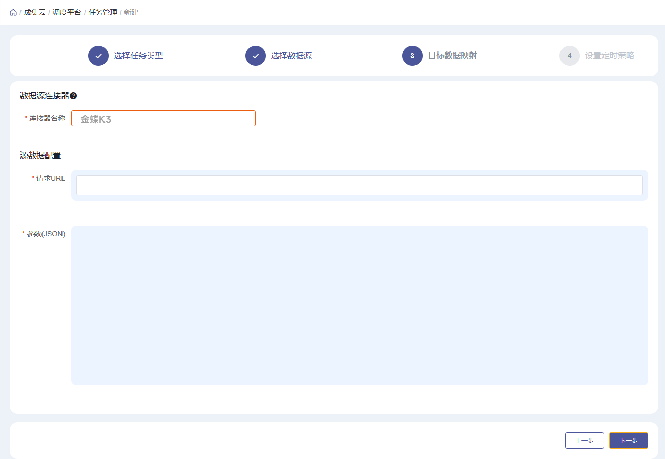 • 选择源系统连接器为金蝶ERP,并配置相关授权参数