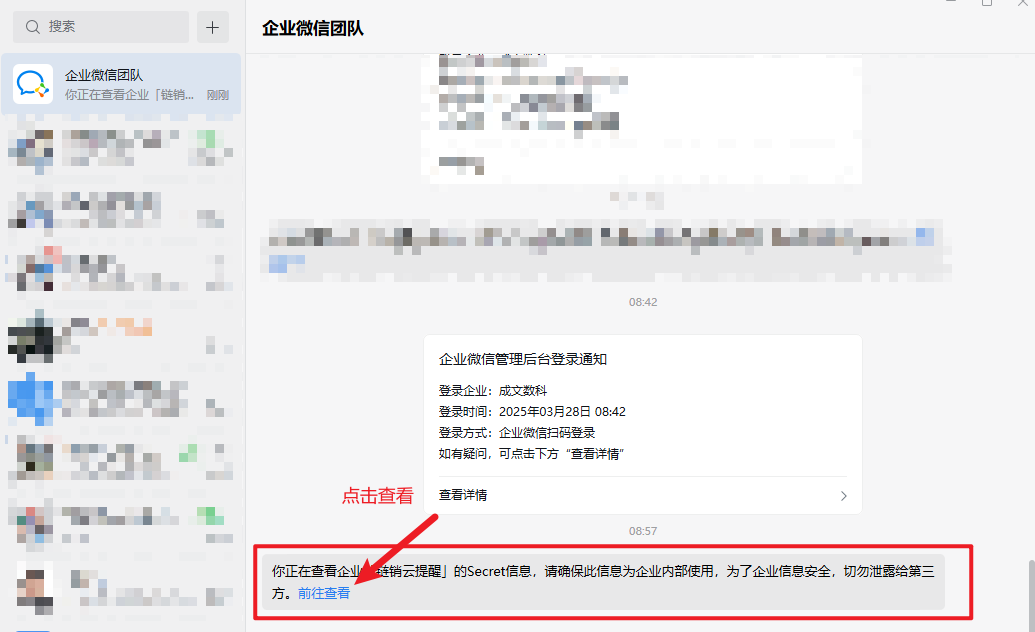 在企业微信客户端中,会收到由【企业微信团队】发送的一条消息,点击消息的【前往查看】即可查看应用Secret