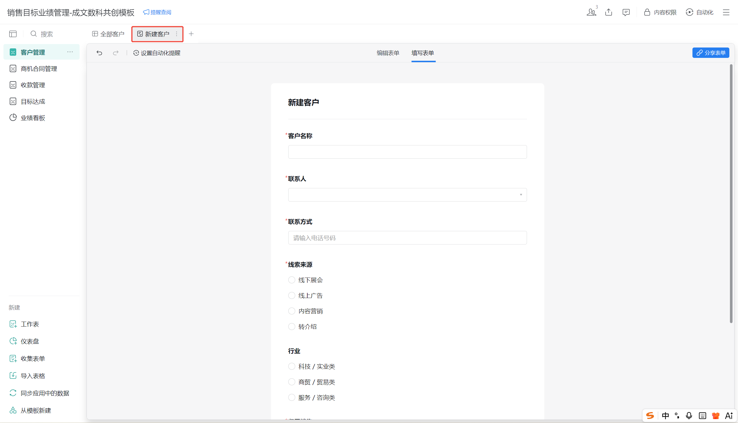 - 客户信息将自动同步至「商机合同管理表」,创建商机时无需重复录入。