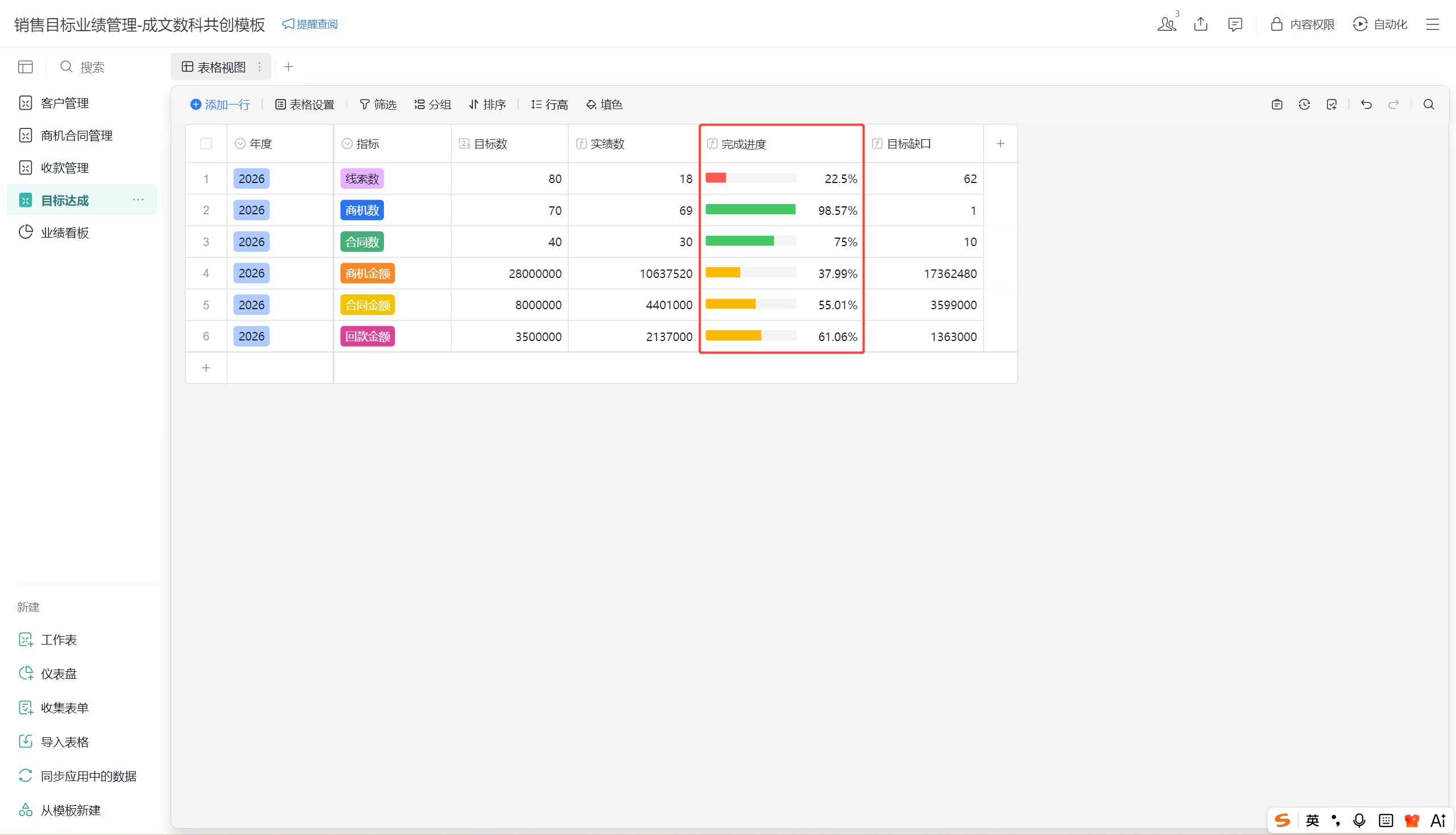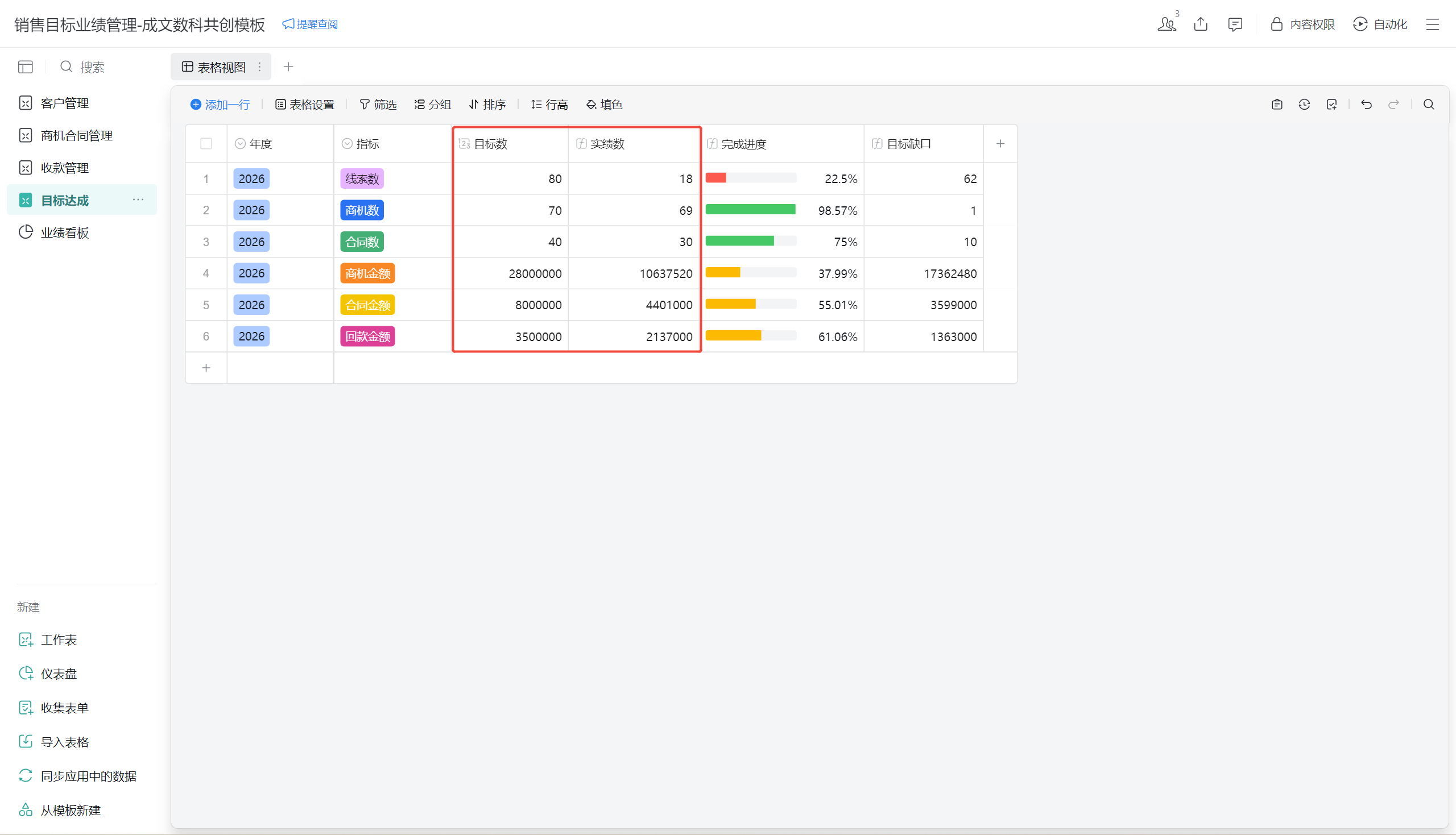 - 「实绩数」自动从「客户管理表」「商机合同管理表」「收款管理表」抓取,实时更新。
