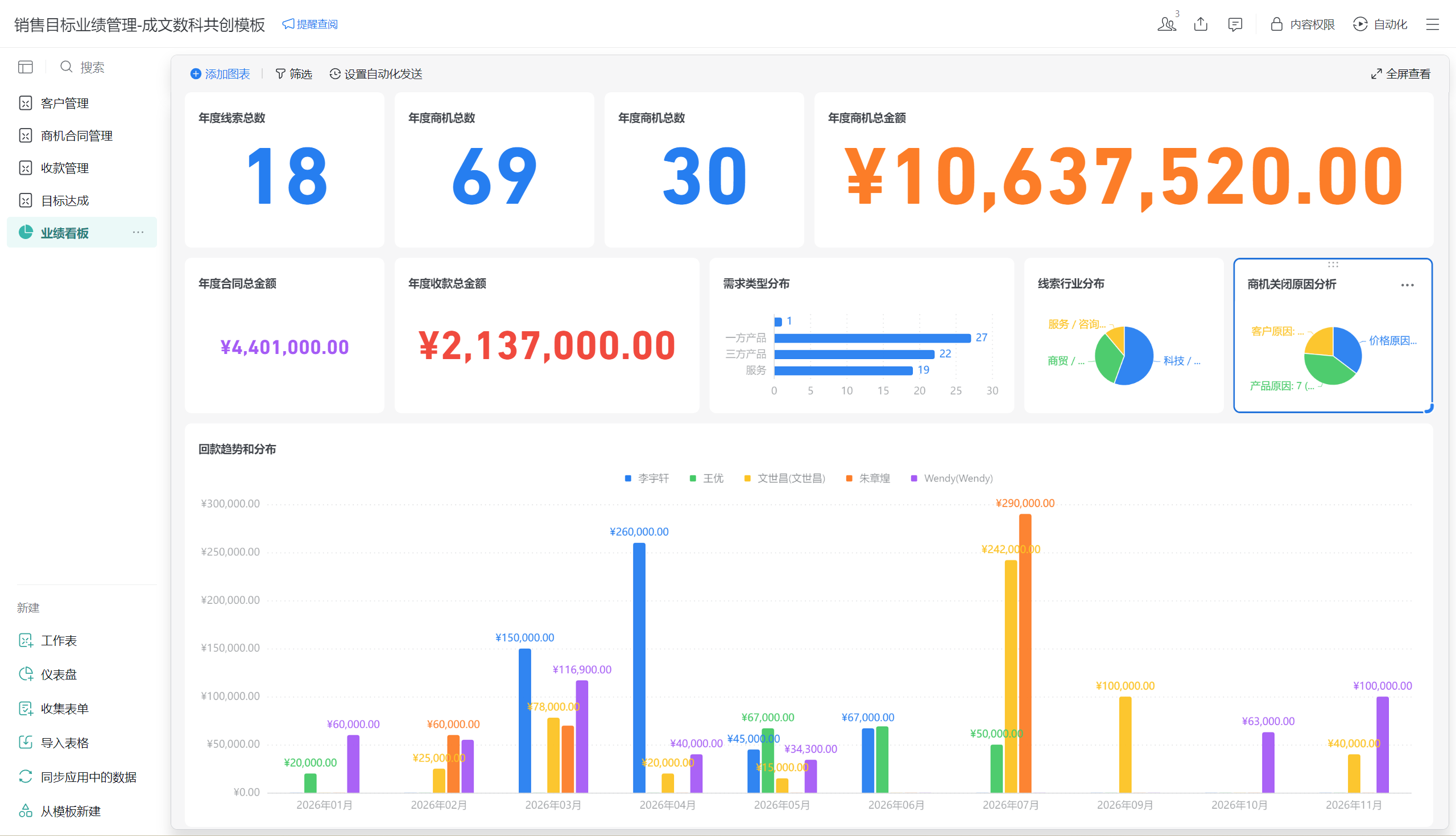 - 顶部大数字卡片展示年度线索总数、商机总数、合同总数、商机总金额、合同总金额、收款总金额,快速掌握全局业绩。
