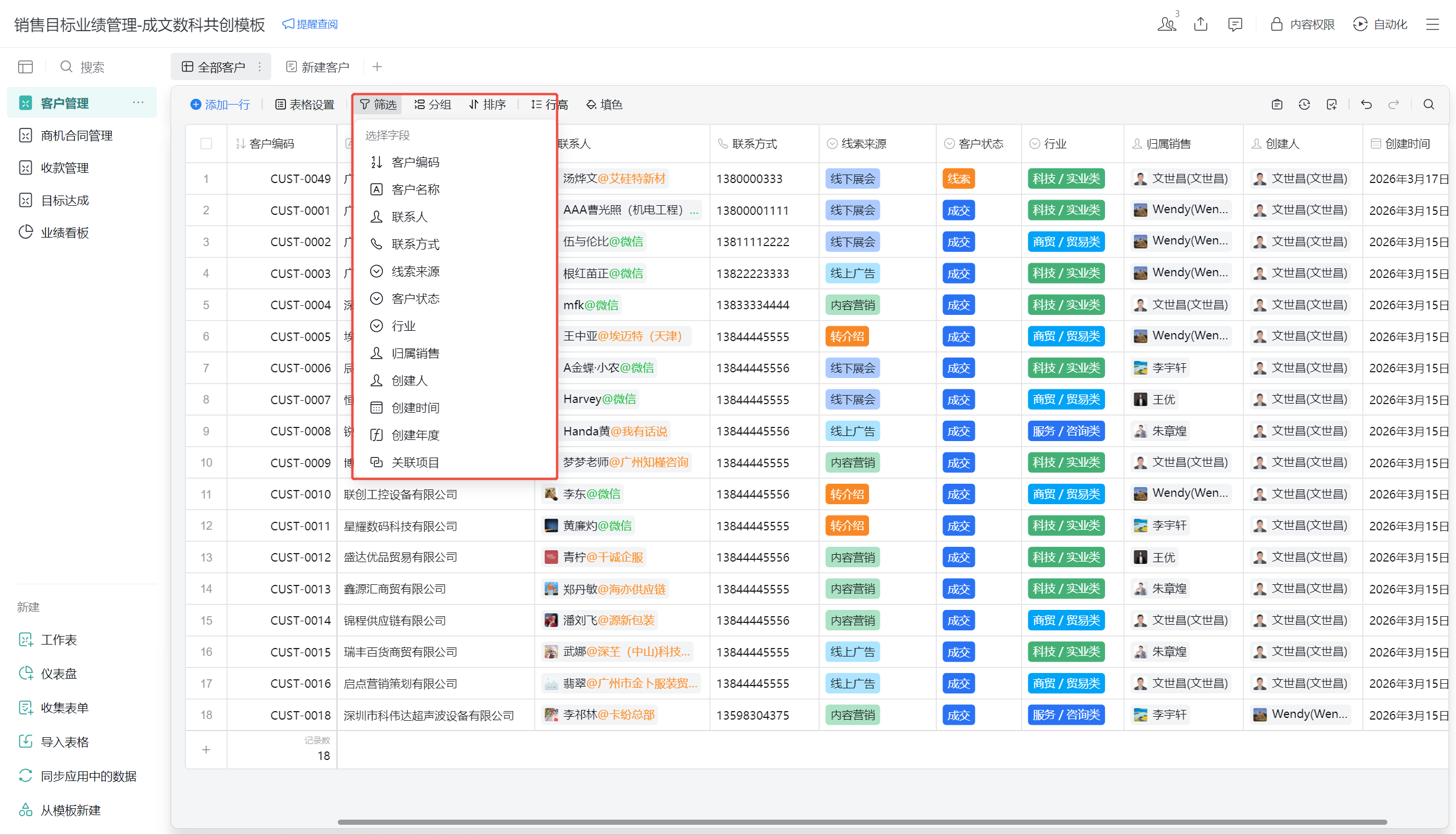 - 支持按时间、归属销售、行业等维度筛选,精准查看特定范围数据。