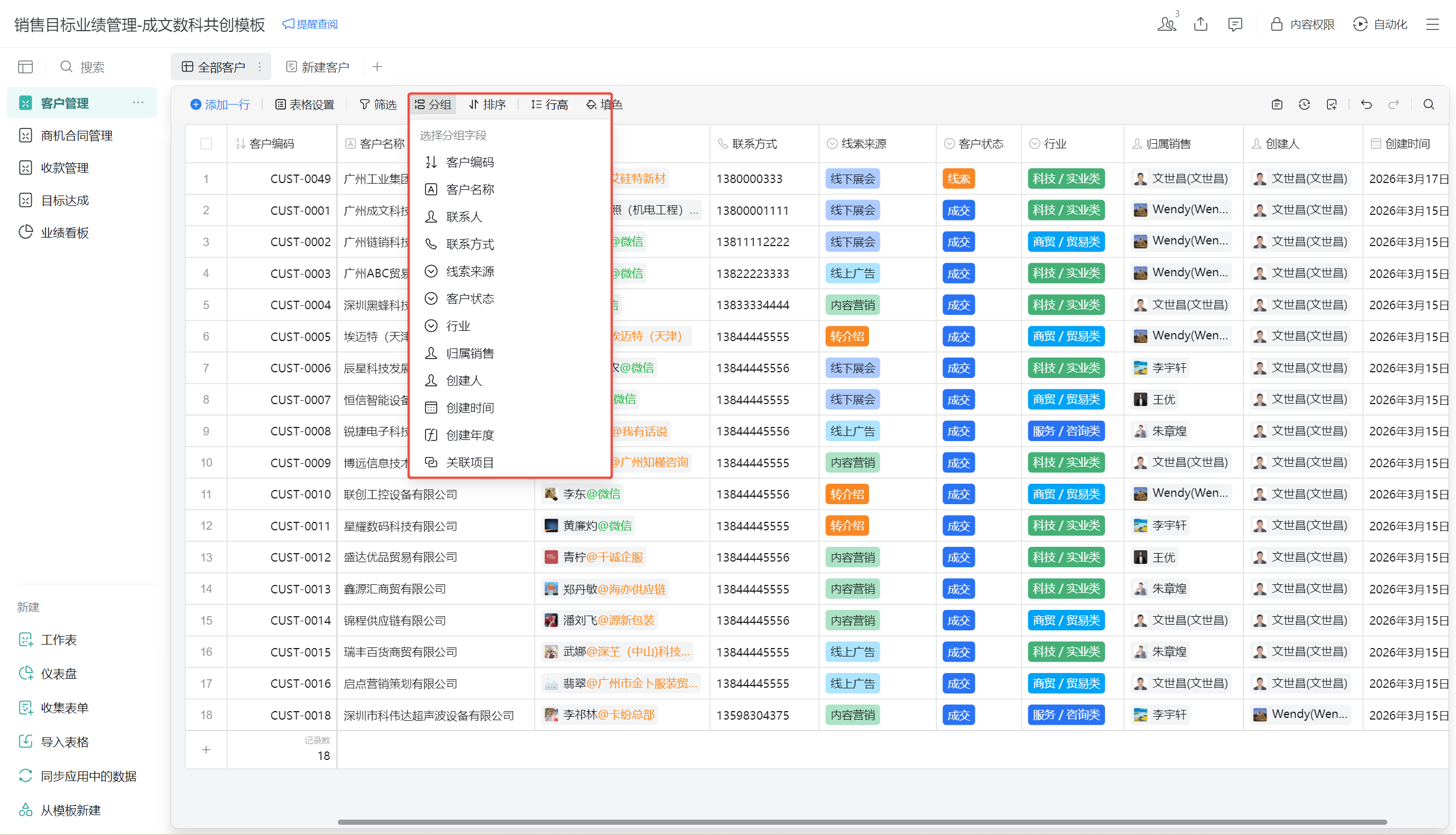 - 点击「分组」,按行业/归属销售分组,直观查看各维度客户分布。