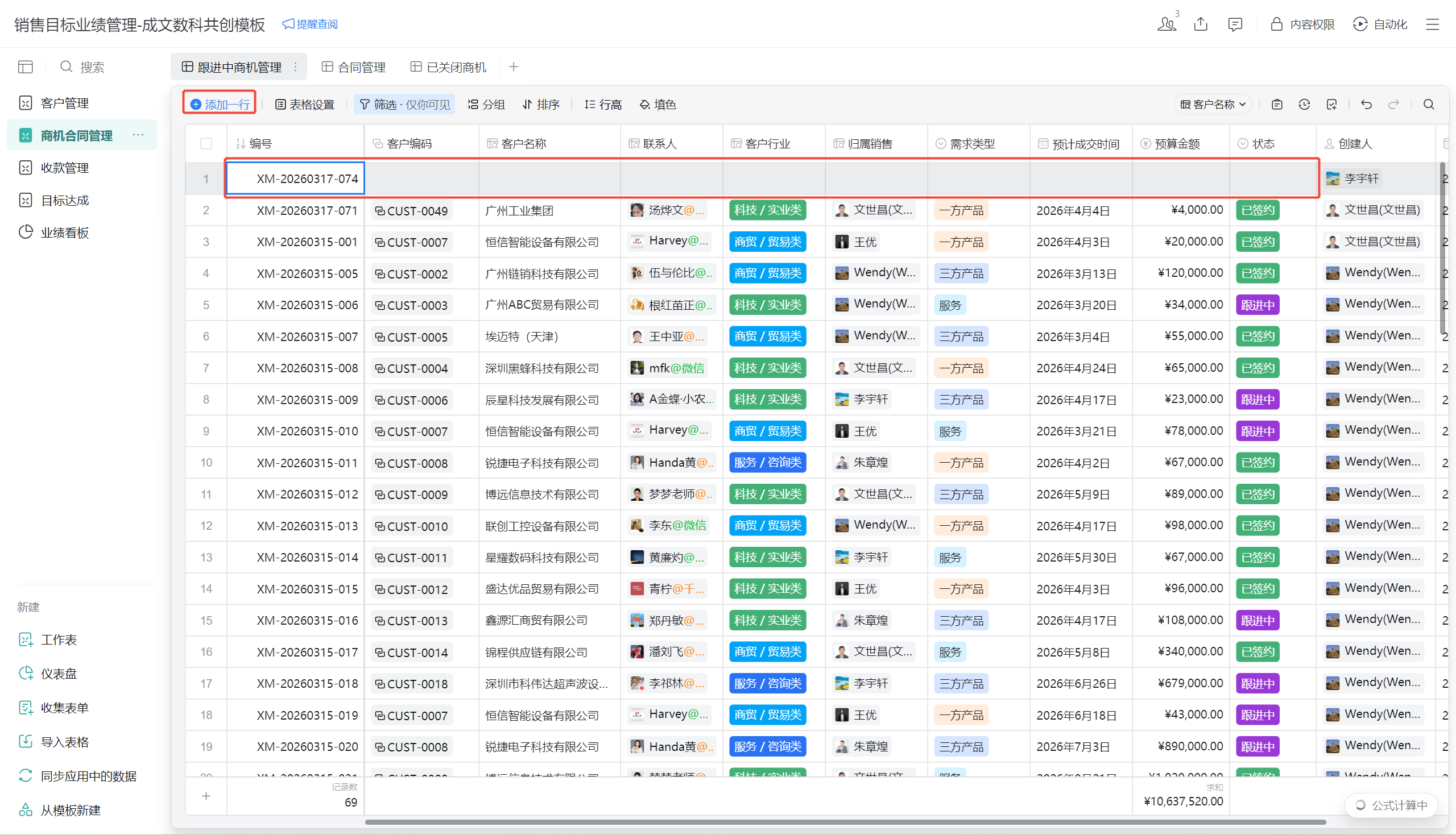 功能定位:管理从商机到合同的全生命周期,通过「状态」区分商机/合同,记录金额、进度与签约信息。