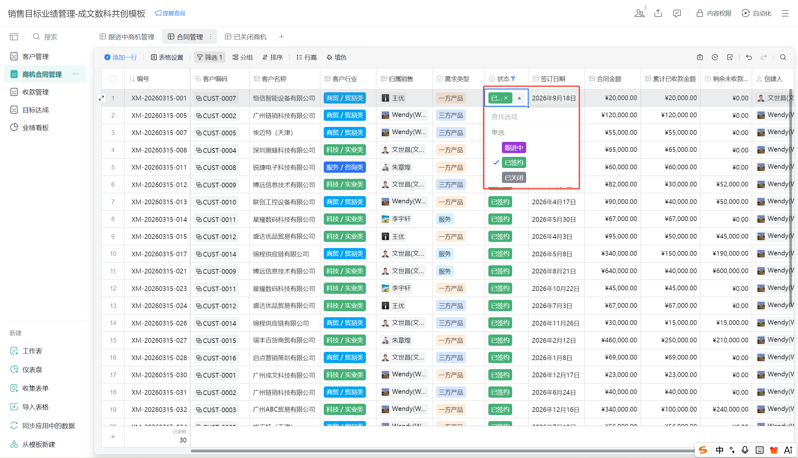 - 「合同管理」视图:仅展示已签约合同,便于回款跟踪。