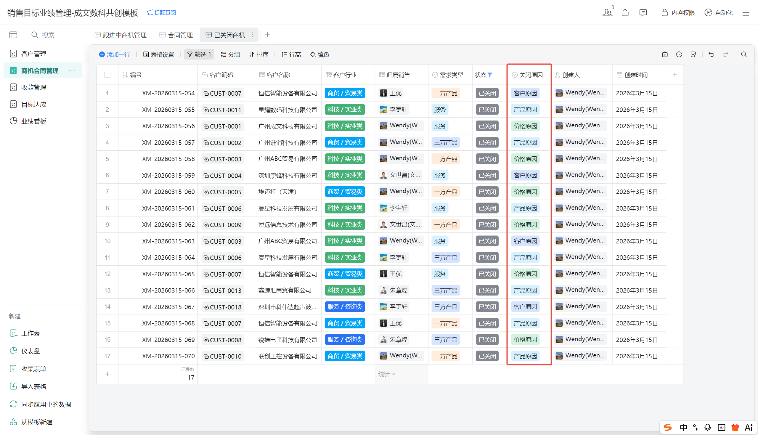 - 「已关闭商机」视图:统计丢单原因,用于团队复盘分析。