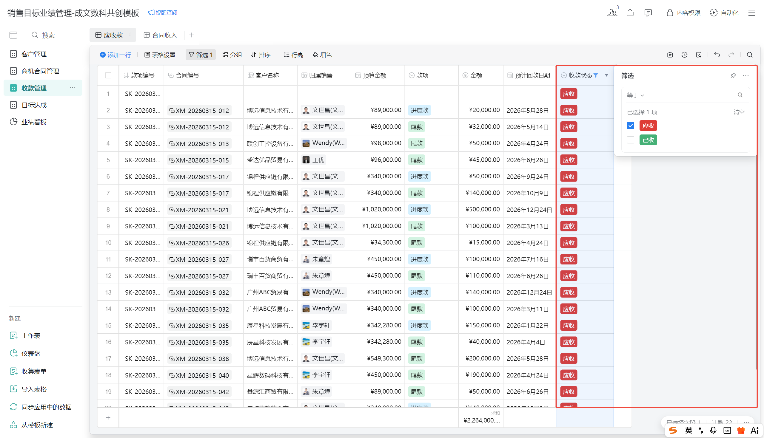 - 收款记录将自动汇总至「商机合同管理表」的「已回款总额」字段,并同步至「目标达成表」与「业绩看板」。